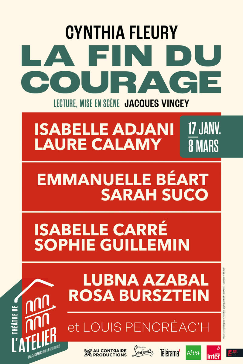 🎭 Vu « La fin du courage » au théâtre de l’Atelier, avec Isabelle Adjani et Laure Calamy. Quel gâchis ! Les deux – très grandes – comédiennes, livret en main, lisent plus qu’elles interprètent le texte de Cynthia Fleury. Le spectacle de Laure Calamy, encordée, en combinaison d’alpiniste se débattant avec son paquet de feuilles est ridicule. Un suicide artistique qui occulte tout le reste.
